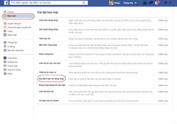 Bước 2: Vào mục Bảo mật và bấm đường dẫn Chỉnh sửa đối với mục con Địa điểm bạn đã đăng nhập.