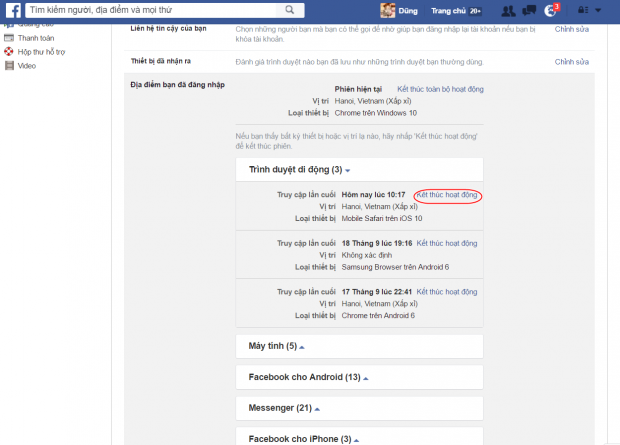 Bước 3: Kiểm tra thông tin các phiên đăng nhập trong danh sách và bấm đường dẫn Kêt thúc hoạt động đối với phiên đăng nhập trên máy người khác. Lúc này, Facebook sẽ đăng xuất tài khoản của bạn trên máy kia.