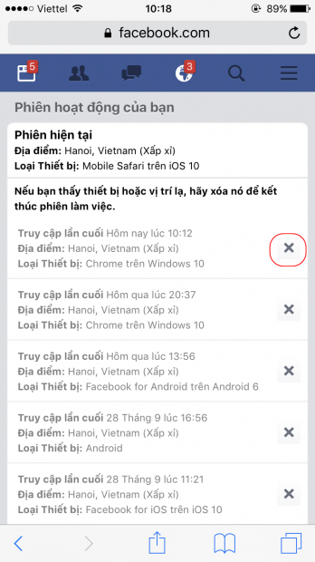 Trong danh sách các thiết bị hiện tại đang đăng nhập tài khoản Facebook, chúng ta muốn đăng xuất thiết bị nào thì bấm dấu x bên cạnh.