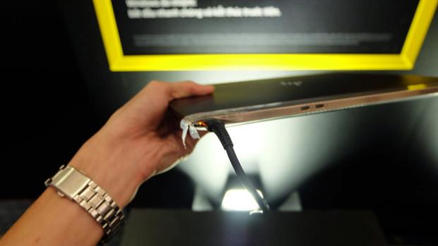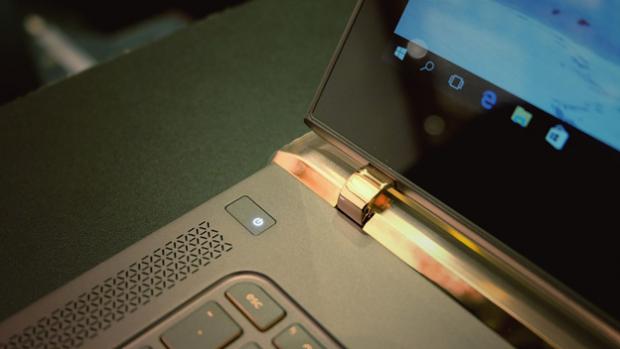 Phần bản lề của máy cũng bằng kim loại và vát cạnh rất khỏe khoắn, cùng với một lớp chrome bóng loáng màu vàng phủ lên, khiến chiếc máy vô cùng nổi bật và sang trọng. Tuy vậy, cái giá của sự bóng loáng này là máy rất dễ bám vân tay và có thể bị trầy xước khi sử dụng.