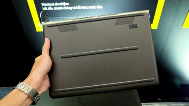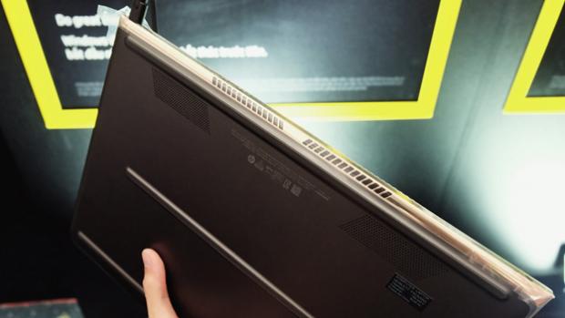 Sát với khu vực bản lề là nơi bố trí hai khe tản nhiệt được thiết kế dạng hình thang với nhiều lỗ nhỏ. Kích thước hai khe tản nhiệt này cũng không quá lớn nhưng vẫn đảm bảo khả năng tản nhiệt tốt. Điểm đặc biệt ở mặt sau Spectre 13 là ta sẽ không hề thấy bất kỳ một con ốc cố định nào. Máy còn trang bị hẳn hai quạt tản nhiệt dù chỉ mỏng hơn 1cm, một thiết kế rất đáng khen ngợi.