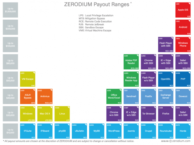 Các mức treo thưởng hack phần mềm của Zerodium, thấp nhất là 10.000 USD, cao nhất là 1,5 triệu USD cho iOS 10.So sánh bảo mật giữa iOS và Android, một sáng lập của Zerodium cho biết 'Mức thưởng liên quan trực tiếp đến độ khó của việc thực hiện một chuỗi hoàn chỉnh các khai thái hệ điều hành, khi cả iOS 10 và Android 7 đều bảo mật tốt hơn các phiên bản trước. Khai thác được iOS 10 khó hơn gấp 7,5 lần so với Android, cũng như nhu cầu bẻ khoá iOS 10 cao hơn Android đến 7,5 lần'.
