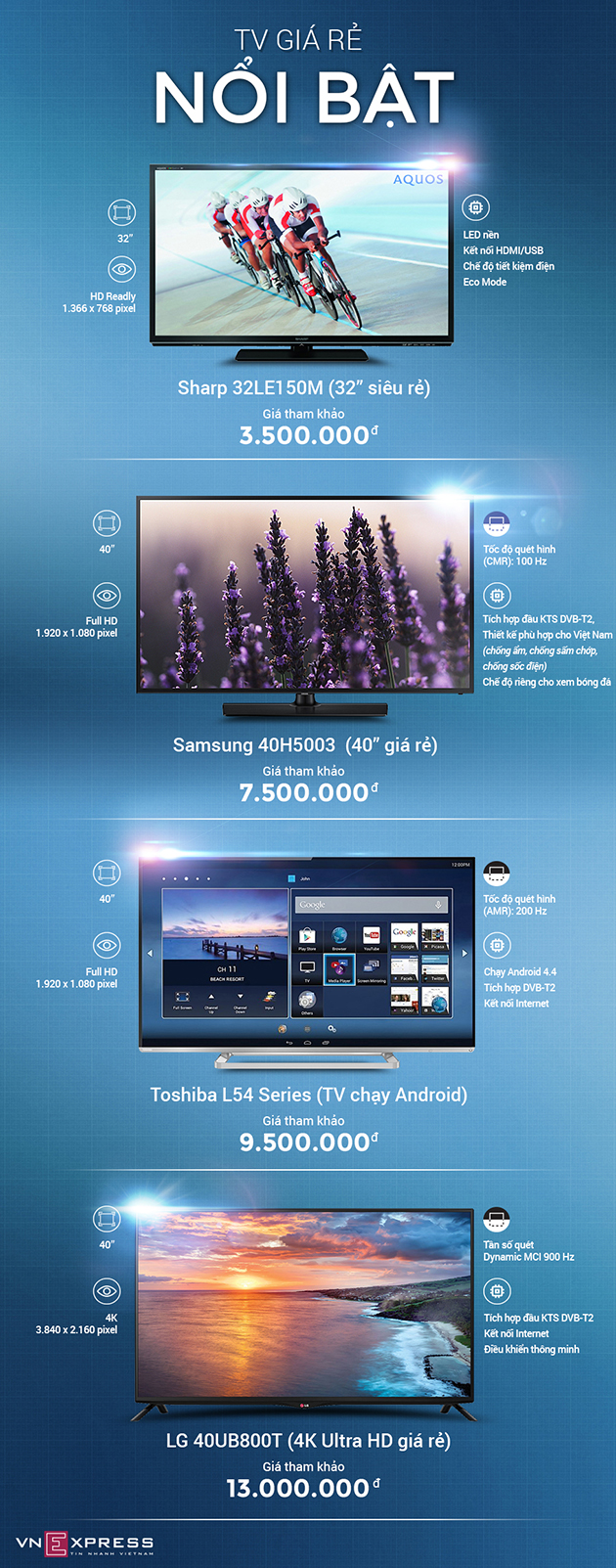 Ngoài dòng cơ bản chủ yếu phục vụ nhu cầu xem truyền hình, xem phim, thị trường TV năm nay còn xuất hiện những model giá rẻ có độ phân giải cao hay Smart TV. Bên cạnh các model màn hình 32 – 40 inch giá rẻ với chức năng cơ bản, năm 2014 còn xuất hiện nhưng dòng sản phẩm tầm dưới 20 triệu đồng, sở hữu màn hình sắc nét 4K Ultra HD hay dòng TV chạy Android giá tốt.