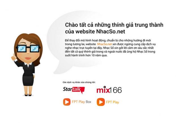 Cụ thể, khi người dùng truy cập vào địa chỉ Nhacso.net sẽ nhận được dòng thông báo từ phía FPT Telecom. Trong thông báo khẳng định, để thay đổi mô hình hoạt động, chuẩn bị cho những hướng đi mới cho tương lai, website Nhacso.net xin được dừng cung cấp dịch vụ nghe nhạc trực tuyến tại đây. Đồng thời, Nhạc số cũng gửi lời cám ơn sâu sắc nhất đến tất cả thính giả trong và ngoài nước đã ủng hộ Nhạc số trong suốt hơn 10 năm qua.