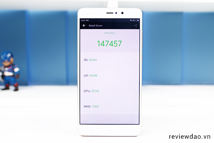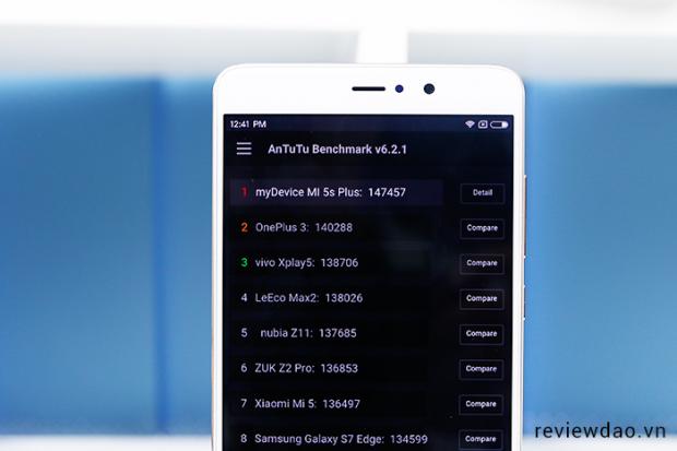 Trên lý thuyết, khi sử dụng các phần mềm chấm hiệu năng như AnTuTu hay 3DMark thì Mi 5s Plus có điểm số rất cao. Cụ thể là với AnTuTu Benchmark của Mi 5s Plus lên đến 147.457 (đây mới chỉ là phiên bản 4GB RAM) và đứng đầu bảng xếp hạng của AnTuTu (tuy nhiên hiện tại iPhone 7 và iPhone 7 Plus vẫn chưa có trong danh sách này)