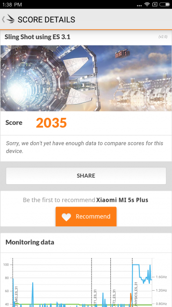 Điểm 3D Mark của máy cũng xếp vào hàng khủng khi Mi 5s Plus đạt được 2035 điểm, nhưng vì vẫn sử dụng GPU tương tự người đàn anh Snapdragon 820 là Adreno 530 nên còn thua kém S7 Edge với Mali-T880.