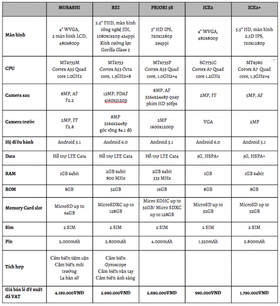 Tiếp theo là ICE2 và ICE2+, cả hai cùng có thiết kế nhỏ gọn trọng lượng nhẹ và bo tròn các góc, giúp mang lại cảm giác vừa tay, thoải mái khi sử dụng. Trang bị cho ICE2 là màn hình 4'', vi xử lý SC7731C 4 nhân tốc độ tương đối cùng hệ điều hành Android 6.0. Được nâng cấp từ ICE2, ICE2+ sở hữu màn hình 5.5 inch sử dụng chip MT6580 4 nhân với tốc dộ 1.3GH. Cả 2 cùng được trang bị Ram 1GB và Rom 8G với mức giá lần lượt 990.000VND cho ICE2 và 1.790.000 cho ICE2+.