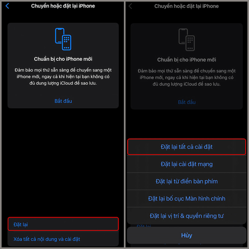 Cách thực hiện: Vào Cài đặt → Chọn mục Cài đặt chung → Chọn Chuyển hoặc Đặt lại iPhone → Nhấn chọn Đặt lại → Chọn Đặt lại tất cả cài đặt.