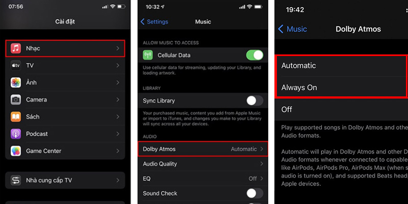 Bước 2: Khi các tùy chọn mới xuất hiện, bạn chuyển phần thiết lập Dolby Atmos thành Tự động (Automatic) hoặc Luôn bật (Always on).