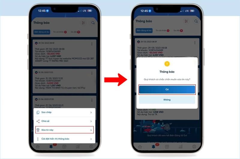 Xóa một thông báo biến động số dư cụ thể giúp bạn loại bỏ nhanh chóng các thông báo nhạy cảm mà không làm ảnh hưởng đến lịch sử giao dịch đầy đủ của tài khoản.