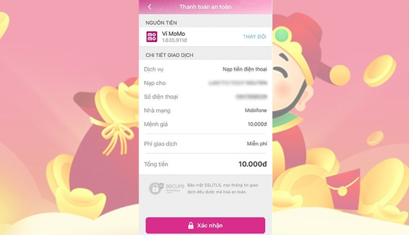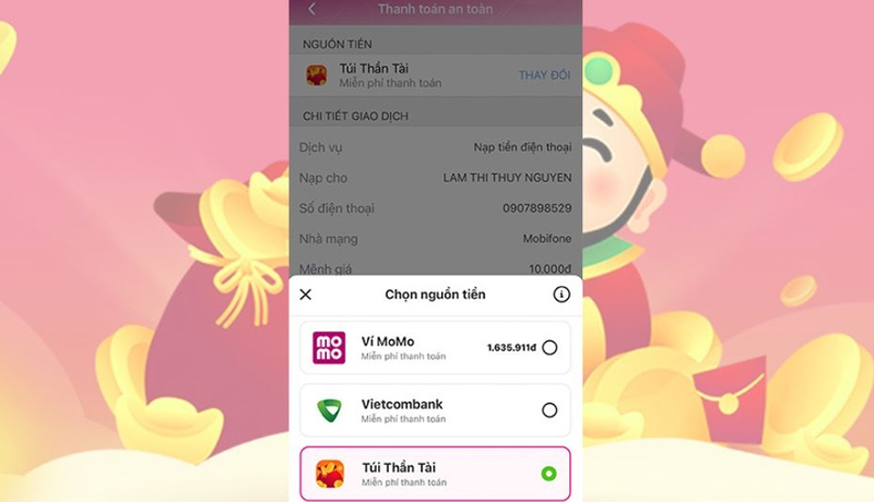 Bước 2: Tại màn hình Xác nhận thanh toán, chọn nguồn tiền là Túi Thần Tài.