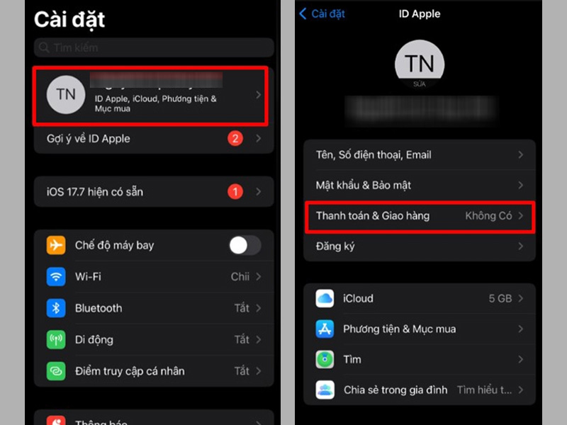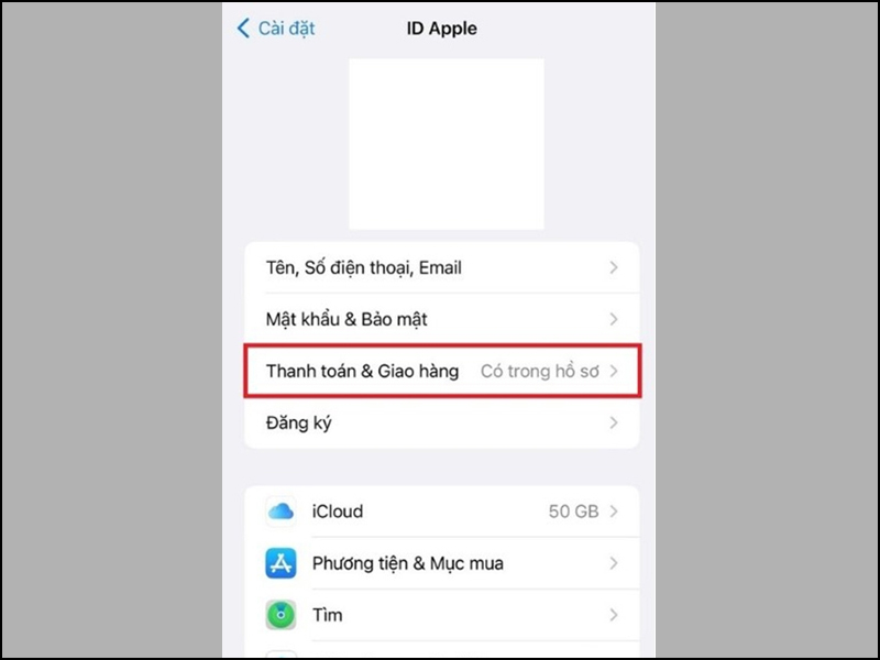 Nhấn vào tài khoản ID Apple, sau đó chọn Thanh toán & Giao hàng