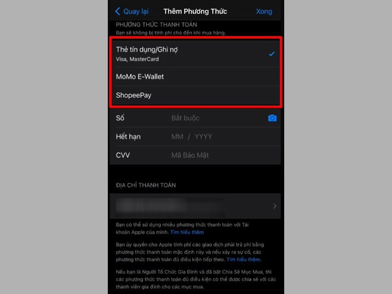 Bước 3: Điền đầy đủ thông tin yêu cầu và thực hiện theo yêu cầu từ hệ thống để thêm phương thức thanh toán mới trên iPhone.