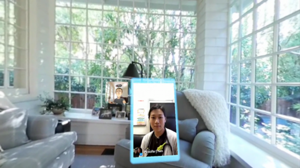 Zuckerberg trình diễn tính năng gọi điện video ngay trong môi trường thực tế ảo với vợ mình là Priscilla Chan.