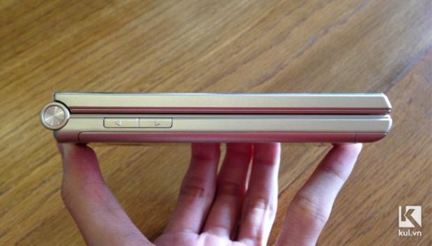 Cạnh trái của máy với hai phím tăng/giảm âm lượng. Do là máy nắp gập nên Freetel Musashi khá dày, khoảng 17,5mm.