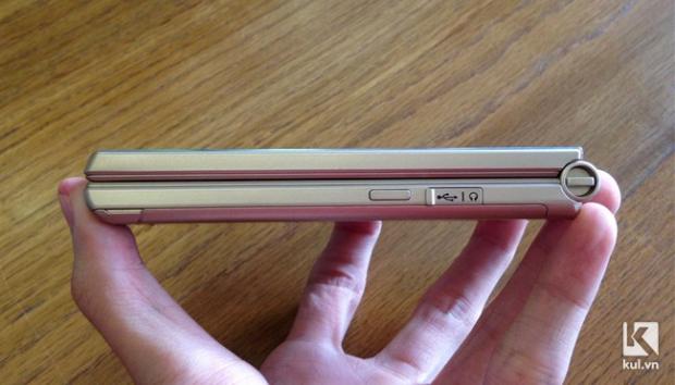 Cạnh phải máy bao gồm phím nguồn và cổng sạc microUSB. Đặc biệt, cổng sạc của máy được bảo vệ bằng một nắp che. Tai nghe đi kèm sử dụng chung với cổng sạc thông qua adapter đi kèm, khá bất tiện. Phần bản lề có thêm khe nhỏ để bạn có thể gắn dây đeo vào trang trí hoặc đeo vào cổ tay cho an toàn khi cầm sử dụng.