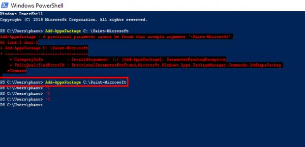 Bước 5: Ở dòng “PS C:\Users\...” Gõ “Add-AppxPackage C:\Paint-Microsoft”