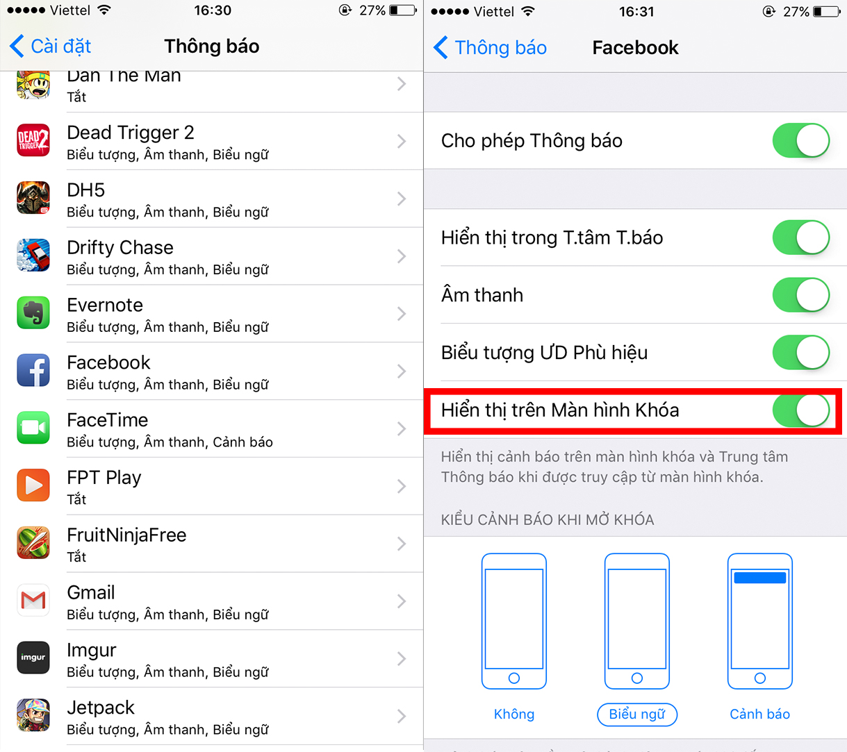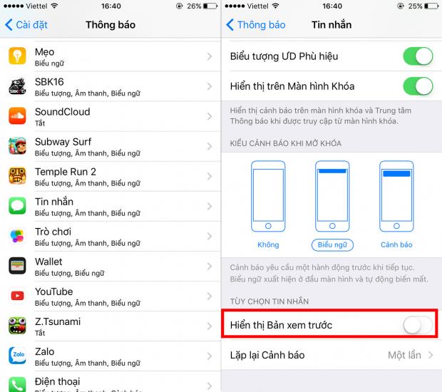 Tại đây bạn vẫn giữ mục Hiển thị trên màn hình khóa (Show on Lock Screen) được bật lên để điện thoại vẫn báo tin nhắn tới, nhưng mục Hiển thị bản xem trước (Show Preview) hãy tắt nó đi.