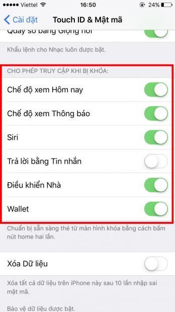 Bên cạnh đấy nếu muốn an toàn nhất có thể, tránh mọi sự phiền toái thì hay tắt hết mọi thứ trong phần Cho phép truy cập khi bị khóa (Allow Access When Locked) của mục Touch ID & Mật mã (Touch ID and Passcode) trong phần Cài đặt (Settings).