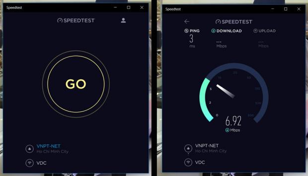 Ngay khu vực trung tâm có biểu tượng “GO” lớn để bạn tiến hành kiểm tra ngay tốc độ mạng Internet mà bạn đang kết nối, bên dưới là nơi hiển thị tên và vị trí của kết nối. Khi nhấn “GO”, giao diện đo tốc độ mạng được hiển thị theo dạng đồng hồ số giống như trên ứng dụng di động nhưng có phần đơn giản hơn.