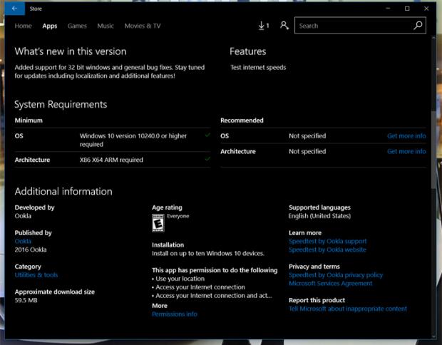 Công cụ cung cấp 3 thông số, gồm: Ping (độ trễ khi kết nối với máy chủ), Download (tốc độ tải dữ liệu), Upload (tốc độ đẩy dữ liệu) được tính bằng đơn vị megabit/giây. Nhược điểm nhỏ của công cụ dành cho Windows 10 PC chính là không thể thay đổi đơn vị đo giống như trên trình duyệt web.