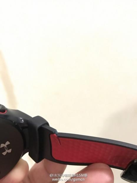 Có vẻ như đồng hồ sử dụng dây đeo bằng silicon và không thay thế nhanh được. Phiên bản rò rỉ có vẻ có 2 màu đỏ và đen, tích hợp cảm biến đo nhịp tim. Ở mặt bên thiết bị có tổng cộng 3 nút.