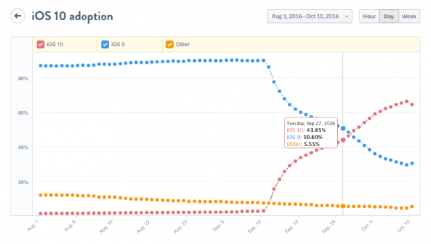 Phần gia tăng đột biến tỷ lệ iOS 10 ở khoảng cuối tháng 9 một phần là do người dùng có trên tay iPhone 7 và iPhone 7 Plus mới, vốn đã được cài sẵn iOS 10.