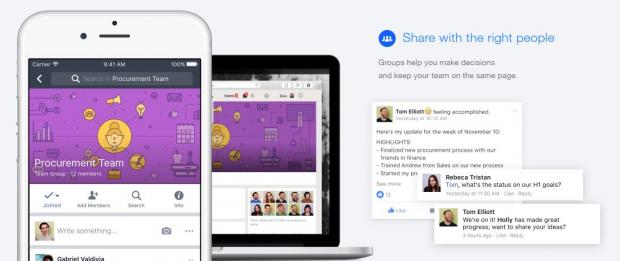 Người dùng Workplace có thể tạo các nhóm (Groups) cho nhóm làm việc của mình. Có lẽ tính năng hấp dẫn nhất là người dùng ở công ty này có thể kết hợp người dùng ở công ty khác để cùng gia nhập vào một Group, rất tiện cho việc bàn thảo công việc và hợp tác giữa các bên.
