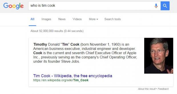 Thế nhưng, với Google Now trên một chiếc Galaxy S7, với câu hỏi tương tự, thông tin tiểu sử chi tiết của CEO Apple trên Wikipedia. Dĩ nhiên Google Now hoàn toàn hiểu câu lệnh “Gửi email cho Tim Cook”, nó cũng lấy được đúng thông tin liên lạc của ông này trong điện thoại của Mossberg.