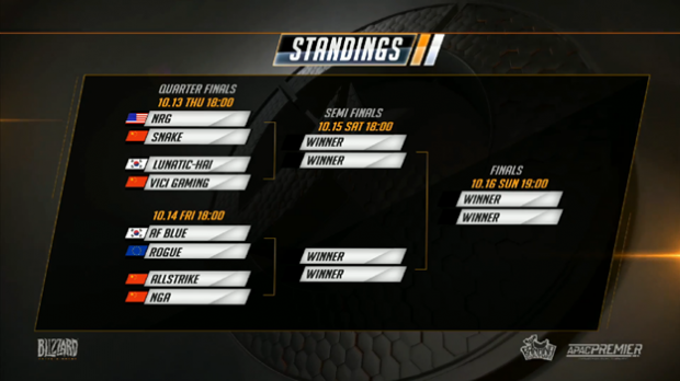 12 đội đấu sẽ được chia làm 3 bảng. Sau khi tranh tài tại vòng loại trực tuyến, 8 đội chiến thắng chung cuộc đã lộ diện gồm NRG, VG và SNAKE ở Bảng A, Lunatic-HAI và ROGUE bảng B và AF BLUE, NGA và ALLSTRIKE bảng C.