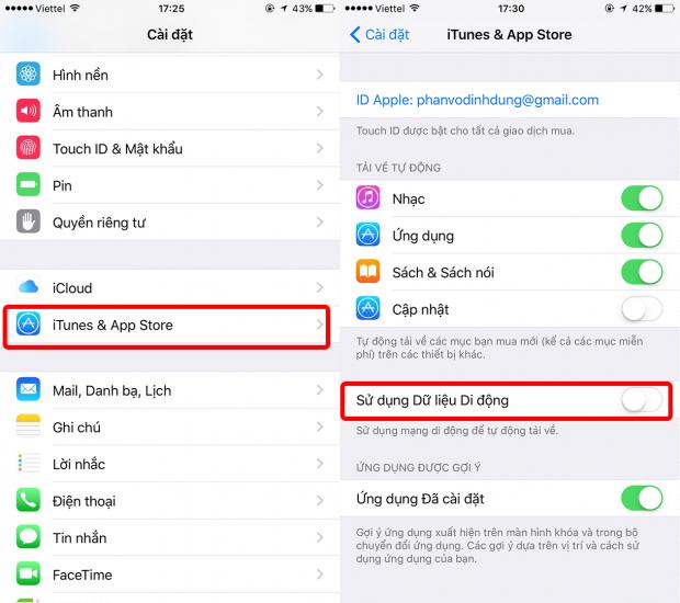 Cũng như việc tự đồng bộ hóa iCloud thì việc cập nhật ứng dụng mà không được sự kiểm soát của chúng ta cũng ảnh hưởng rất nhiều đến việc tại sao dữ liệu mạng lại hết nhanh như vậy!? Cách làm như sau: Cài đặt -> iTunes & App Store -> bỏ chọn 'Sử dụng Dữ liệu Di Đông'.