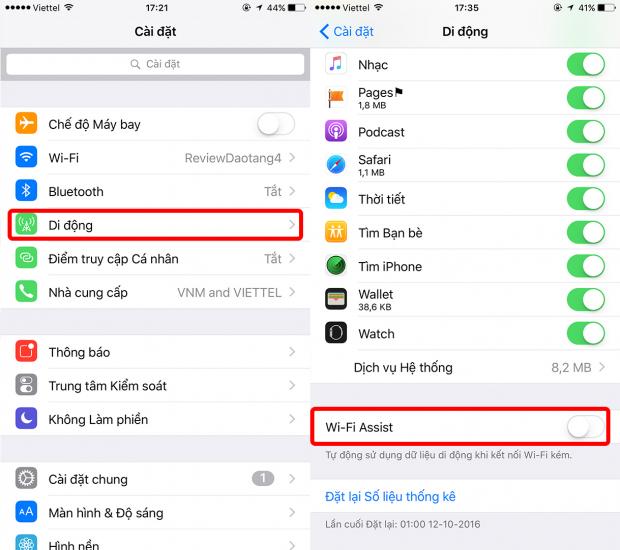 Cách thực hiện vào Cài đặt -> Di động -> bỏ chọn Wi-Fi Assist.