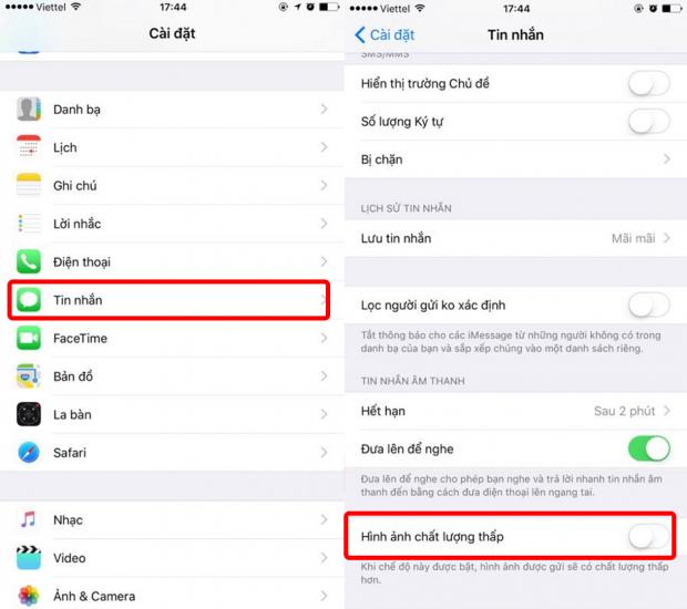 Cách làm như sau: Cài đặt -> Messange -> chọn 'Hình ảnh chất lượng thấp' (điều này chỉ có thể làm được trên iOS 10)