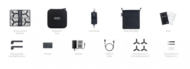 Bên trong hộp sản phẩm, HCP còn bao gồm 2 viên pin, cùng một adapter có sạc cả 2 cùng lúc, hộp đựng bảo vệ, các cánh quạt phụ, và một cáp USB dùng cho việc cập nhật phần mềm điều khiển, một túi đựng có dây đeo.