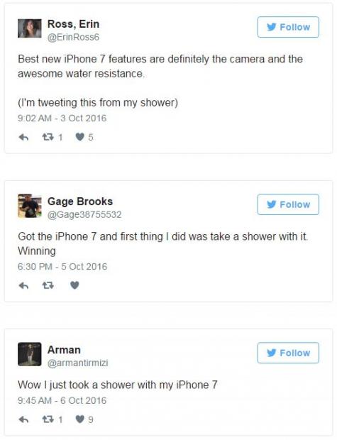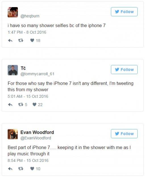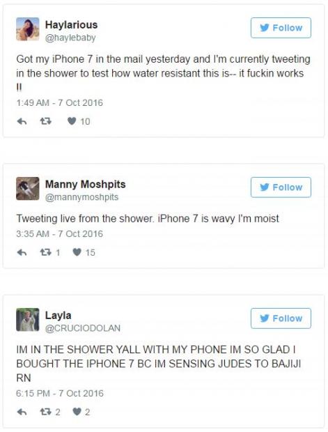 Trên Twitter đã xuất hiện “rần rần” các dòng trạng thái của người dùng iPhone 7, khoe là mình đang vừa tắm vừa xài điện thoại này, lướt Twitter hay Facebook “phà phà” mà không sợ thiết bị hư hỏng.