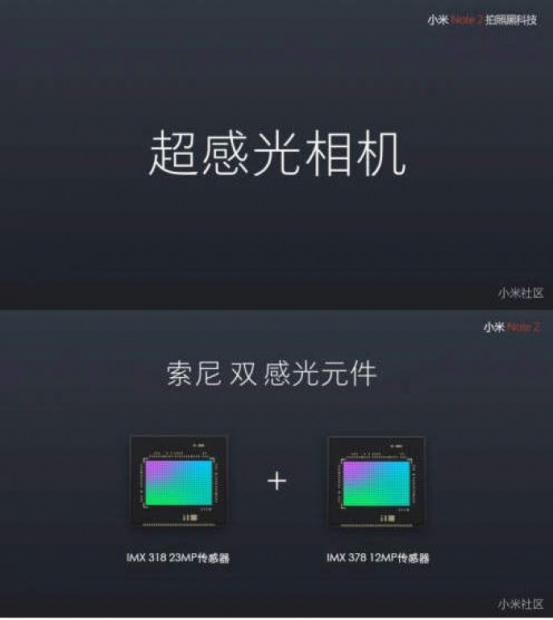 Theo đúng xu thế của các smartphone Trung Quốc thời gian gần đây, Mi Note 2 cũng được trang bị một cụm camera kép, với 1 camera độ phân giải 23MP sử dụng cảm biến Sony IMX318, camera còn lại 12MP cảm biến IMX378 với công dụng là thu lại chiều sâu của bức ảnh tương tự với cụm máy ảnh trên Redmi Pro.