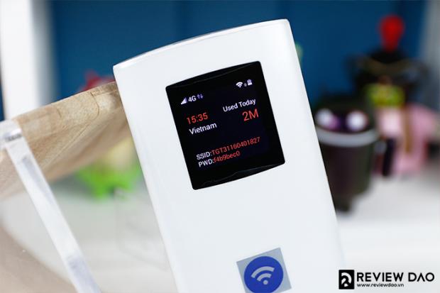 Mặt trước chúng ta có 1 màn hình LCD, hiển thị thông số kĩ thuật của thiết bị như dung lượng pin, cột sóng, ID và mật khẩu của wifi.