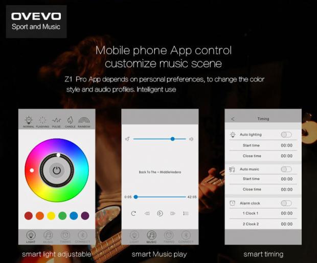 Mẫu loa Ovevo Z1 có kích thước 67.5x65x63 mm với thiết kế hình tam giác có 3 cạnh cong mềm mại, tinh tế. Trên đỉnh của sản phẩm là một mặt kim loại cảm ứng chuyển đổi màu sắc, độ sáng và khung cảnh. Loa Z1 hỗ trợ nhiều thiết bị điện thoại thông minh như các dòng chạy hệ điêuù hành phổ biến Android, iOS, Windows Phone... Qua phần mềm ứng dụng có sẵn trên Android và iOS người dùng dễ dàng tùy biến màu sắc của chiếc loa Z1 và hẹn giờ báo thức.