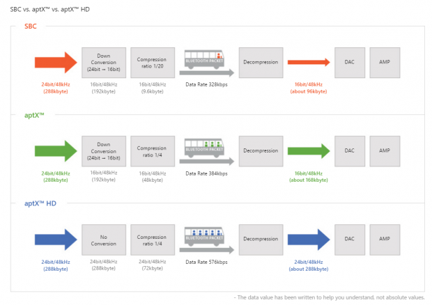 Với XB10, chúng ta có một bộ giải mã DAC 24bit/192kHz, một headamp,... nhưng trước đó, tín hiệu được đưa từ thiết bị phát sang qua kết nối Bluetooth aptX HD. Cho dễ hình dung thì hãng có cung cấp một thí dụ khá dễ hiểu khi so sánh giữa aptX và aptX HD và như có thể thấy trong ảnh, gói tin 24bit/48kHz của aptX HD được nén với tỷ lệ 1/4, sau đó gói tin được chuyển không dây tới thiết bị giải nén. Trong khi đó thì aptX sẽ nén gói tin xuống còn 16bit/48kHz, tiếp theo mới được nén lại và gởi đi nên tốc độ dữ liệu sẽ chậm hơn (384 và 576 kbps).
