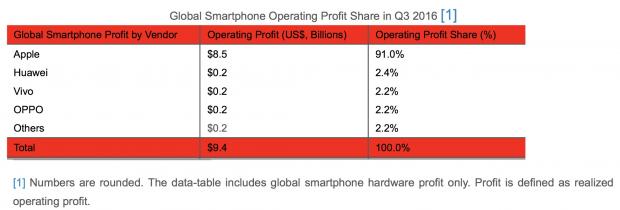 Theo đó, Apple đã vươn lên quay trở lại vị thế dẫn đầu với 91% lợi nhuận toàn thị trường và theo sát sau đó là những tên tuổi đến từ Trung Quốc như Huawei, Vivo và Oppo. Tuy vậy, khoảng cách khi so với ông lớn Apple vẫn còn cách biệt quá lớn. Nhiều nhà phân tích cho rằng Apple đạt doanh thu lớn đến như vậy chính là bởi sự ra mắt thành công của bộ đôi flagship iPhone 7 và iPhone 7 Plus cũng như đối thủ nặng ký nhất là Galaxy Note 7 đã không còn có mặt trên thị trường.