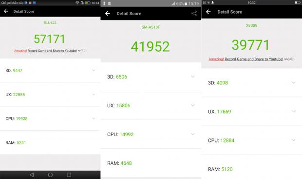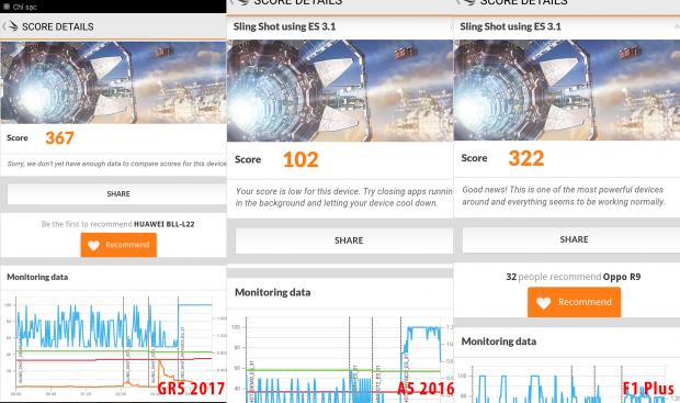 Sử dụng AnTuTu chúng ta sẽ thu được kết khá bất nhờ. OPPO F1 Plus bỗng nhiên bị tụt lại phía sau, tiếp đến là Galaxy A5 2016 và 'ngôi vương' vẫn thuộc về Huawei GR5 2017. Thú vị ở chỗ là điểm 3D của F1 Plus được chấm bằng phần mềm này còn thấp hơn của Galaxy A5 2016.