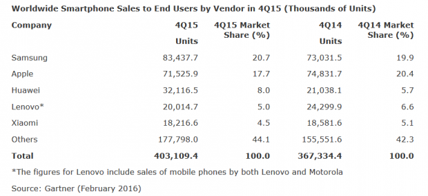 Dẫn đầu doanh số trên thị trường vẫn là Samsung với 83,4 triệu chiếc trong quý này, tăng từ 19,9% doanh số thị trường năm ngoái lên 20,7% trong cùng kỳ năm nay. Sau Samsung và Apple vẫn là Huawei với 8% thị trường, như vậy doanh số tăng lên 40% so với 5,7% quý IV/2014 vì doanh số tăng từ 21 triệu lên 32,1 triệu máy.