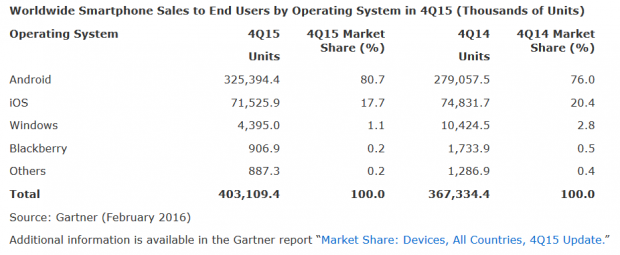 Theo Gartner, quí IV/2015, doanh số của iPhone đạt 71,5 triệu chiếc, thấp hơn mức dự báo thấp nhất trong số các phân tích của Business Insider là 72,7 triệu chiếc. Như vậy, doanh số của Apple trong quý này chiếm 17,7% trên toàn thị trường, giảm từ 20,4% cùng kỳ năm ngoái.