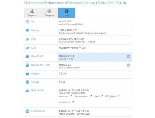 Những tin đồn rò rỉ Galaxy C5 Pro đã xuất hiện từ tháng 9 năm ngoái. Tuy nhiên, cho đến giờ, bức tranh toàn cảnh của thiết bị mới dần trở nên rõ ràng hơn. Mới đây, trên trang đo điểm chuẩn GFXBench, thiết bị đã lộ diện hoàn toàn thông tin về cấu hình. Các thông tin khác đã tồn tại từ trước đó.