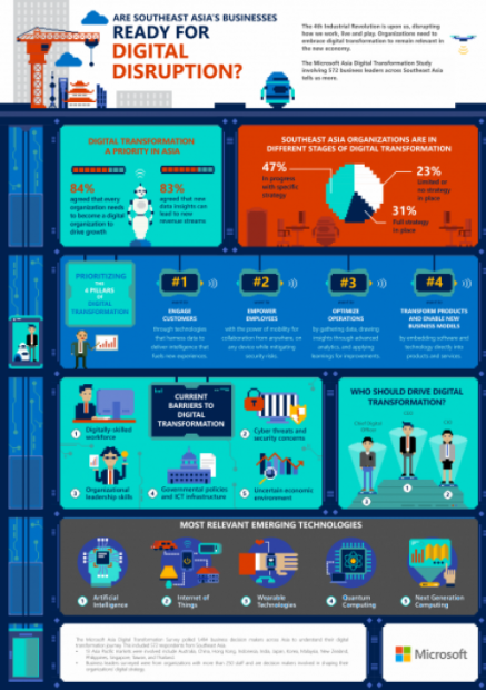 Những tiến bộ công nghệ đã chốt trong Nghiên cứu về chuyển đổi Kỹ thuật số của Microsoft Châu Á*, báo cáo nghiên cứu về nắm bắt kỷ nguyên kỹ thuật mở ra cuộc Cách mạng Công nghiệp lần thứ 4, nơi mà các công nghệ tiên tiến như Internet of Things (IoT), trí tuệ nhân tạo (AI), phân tích dữ liệu tiên tiến, và pha trộn thực tế ảo được hỗ trợ bởi điện toán đám mây để tạo ra khả năng vô hạn trong việc chuyển đổi phương thức sống, làm việc và giải trí. Cuộc cách mạng cùng sự đô thị hóa nhanh chóng, lực lượng lao động thế kỷ mới và môi trường kinh tế toàn cầu đã mở ra những thay đổi xã hội và kinh tế với tốc độ chưa từng có.