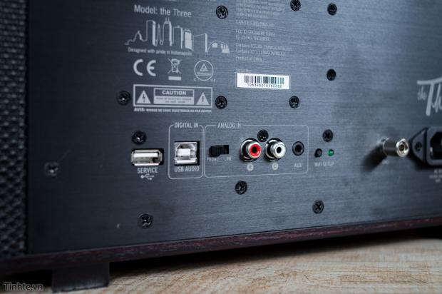 Chi tiết hơn, chúng ta có các cổng kết nối USB để cập nhật firmware, cổng USB Audio, cổng RCA với 2 tùy chọn line hoặc phono và một lỗ cắm UAX. Bên cạnh chính là nút bấm để kết nối loa với mạng wifi.