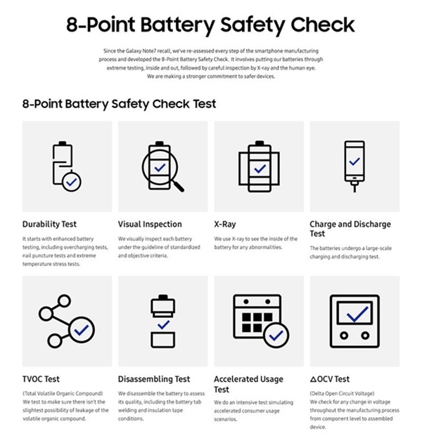 Đặc biệt, Samsung SDI cũng cho biết thêm là sẽ mua mới một hệ thống kiểm tra pin bằng tia X. Đây là một phần trong hệ thống kiểm định không khiếm khuyết mới của công ty để kiểm tra tất cả sản phẩm thay vì phương pháp kiểm định lấy mẫu như trước kia. Bên cạnh đó, những bài kiểm tra pin thành phẩm trước đây cũng sẽ được nâng cao độ khắc nghiệt lên nhiều lần.