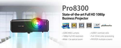 Pro8300 sở hữu độ sáng 3.000 ANSI lumen, độ phân giải thực Full HD máy hỗ trợ 2 cổng HDMI, VGA vào, tích hợp loa 10w trên máy, Zoom quang học 5X, tự động chỉnh vuông ảnh, cho phép hiển thị cùng 1 lúc 4 tín hiệu đầu vào… PRO8300 xứng tầm là một máy HD thứ thiệt cho công sở với những đòi hỏi khắt khe nhất về chất lượng hình ảnh và khi đó Pro8300 sẽ biến cả phòng họp công ty thành rạp chiếu phim di động.
