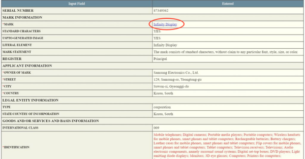 Theo số liệu mới nhất từ USPTO (Cơ quan bằng sáng chế và nhãn hiệu Hoa Kỳ) thì Samsung đã quyết định chọn biệt danh “Infinity Display” dùng làm tên gọi cho màn hình cong trên Galaxy S8 và Galaxy S8 Plus.