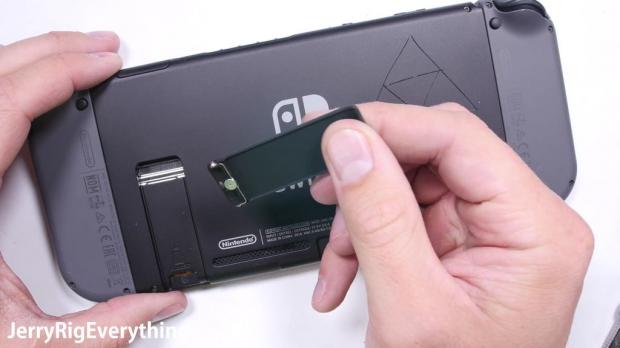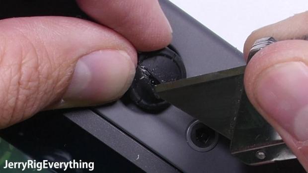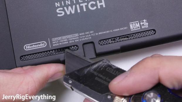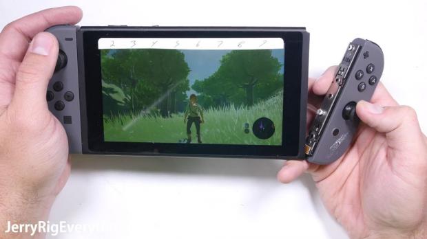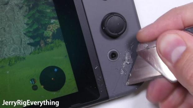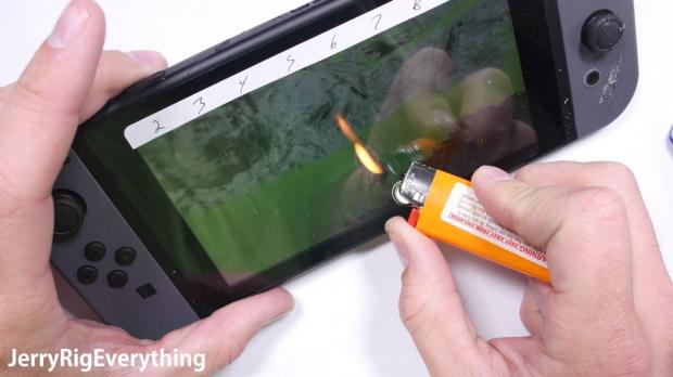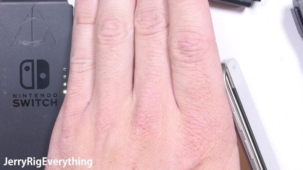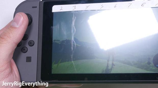 Bài test đầu tiên mà Jerry đưa ra chính là Scratch Test, kiểm ra khả năng chống trầy xước của màn hình cũng như độ bền chắc của những bộ phận khác. Kết quả cho thấy chất liệu màn hình của máy Switch được làm từ nhựa, khi bị xước ở mức độ 3. Đa phần màn hình của những thiết bị di động được thiết kế từ thủy tinh, tuy nhiên có vẻ vì đối tượng sử dụng máy Switch có cả trẻ nhỏ cho nên Nintendo quyết định sử dụng nhựa thay cho thủy tinh nhằm tránh trường hợp vỡ màn hình gây thương tích cho người dùng.